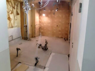 新規設計にて男女トイレ、給湯室部分を造作するにあたり、上階より区画から全てを解体撤去させていただきました。